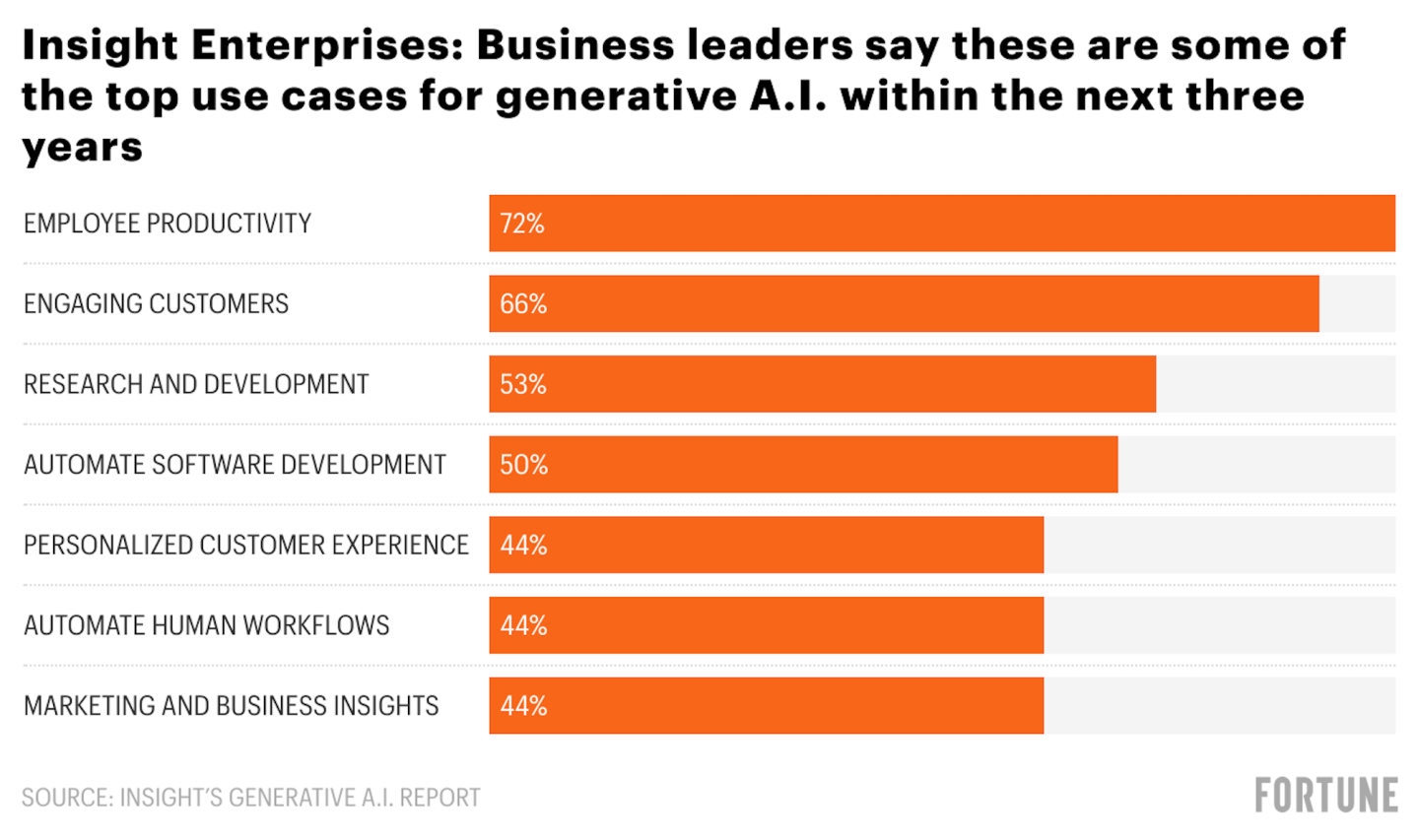 The Harris Poll, on behalf of Insight Enterprises (Nasdaq: NSIT), conducted a survey of 405 U.S. director-level or above professionals at companies with 1,000 or more employees on how they're thinking about and exploring generative A.I. technologies. Within the next three years, most business leaders surveyed expect to adopt generative A.I. to make employees more productive (72%) and enhance customer service (66%), according to the report. About half expect the technology to assist with research and development as well as automate software development or testing. Other use cases include surfacing market insights, personalizing customer experience, and automating software development and human workflows. The survey also found that 81% of respondents say their company already has established or implemented policies and strategies around generative A.I. or is currently in the process of doing so.