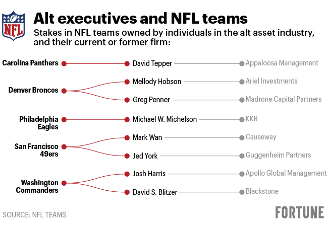 The rise in alt exec ownership is, of course, in part due to the stunning returns alt firms have made in their bread-and-butter businesses over the past 25 years. For example, private equity funds generated an annualized return of 14.8% for the 25 years ended December 2020, more than double the 5.76% produced by the S&P 500 for the same time period, according to a 2022 World Economic Forum study. That coincided with a gradual softening in ownership rules by the leagues themselves. In 2019 Major League Baseball became the first of the professional sports leagues to allow private equity funds to buy passive stakes in teams. The National Basketball Association, the National Hockey League, and Major League Soccer followed, each allowing PE to invest in their teams but only for minority stakes. The last holdout is the National Football League, or NFL, which still bars private equity and sovereign wealth funds from ownership.