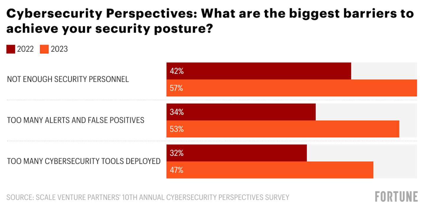 Enterprise security leaders are still struggling to attract, hire, and retain skilled cybersecurity professionals, according to the report. This year, 57% of firms indicated the biggest barrier to achieving their desired security posture was not enough security personnel, up from 42% from last year's survey. Other barriers security teams face include too many alerts, too many false positives, and too many cybersecurity tools deployed. The findings are based on a survey of 300 cybersecurity security leaders in the U.S. (CISOs, CIOs, VPs, directors, and IT managers).