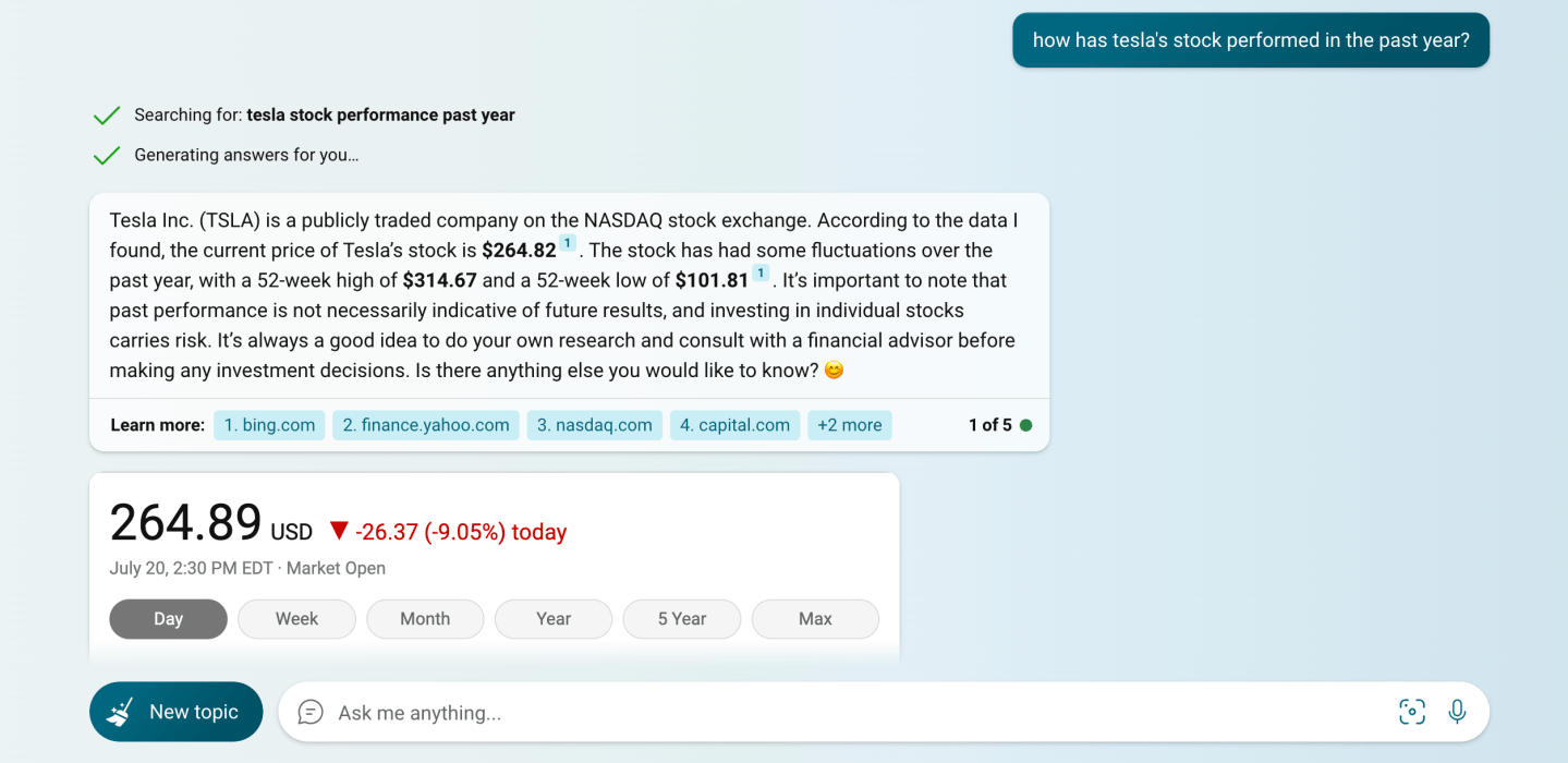 – Bing Chat is available under the app’s search function. Once you type in a prompt, Bing Chat will start to generate a response to it (see screenshot below). You can ask essentially any question, from advice on buying clothes to how Tesla’s stock price is faring, and it will answer with a textual summary, footnoted by hyperlinks and citations indicating the source of the information.