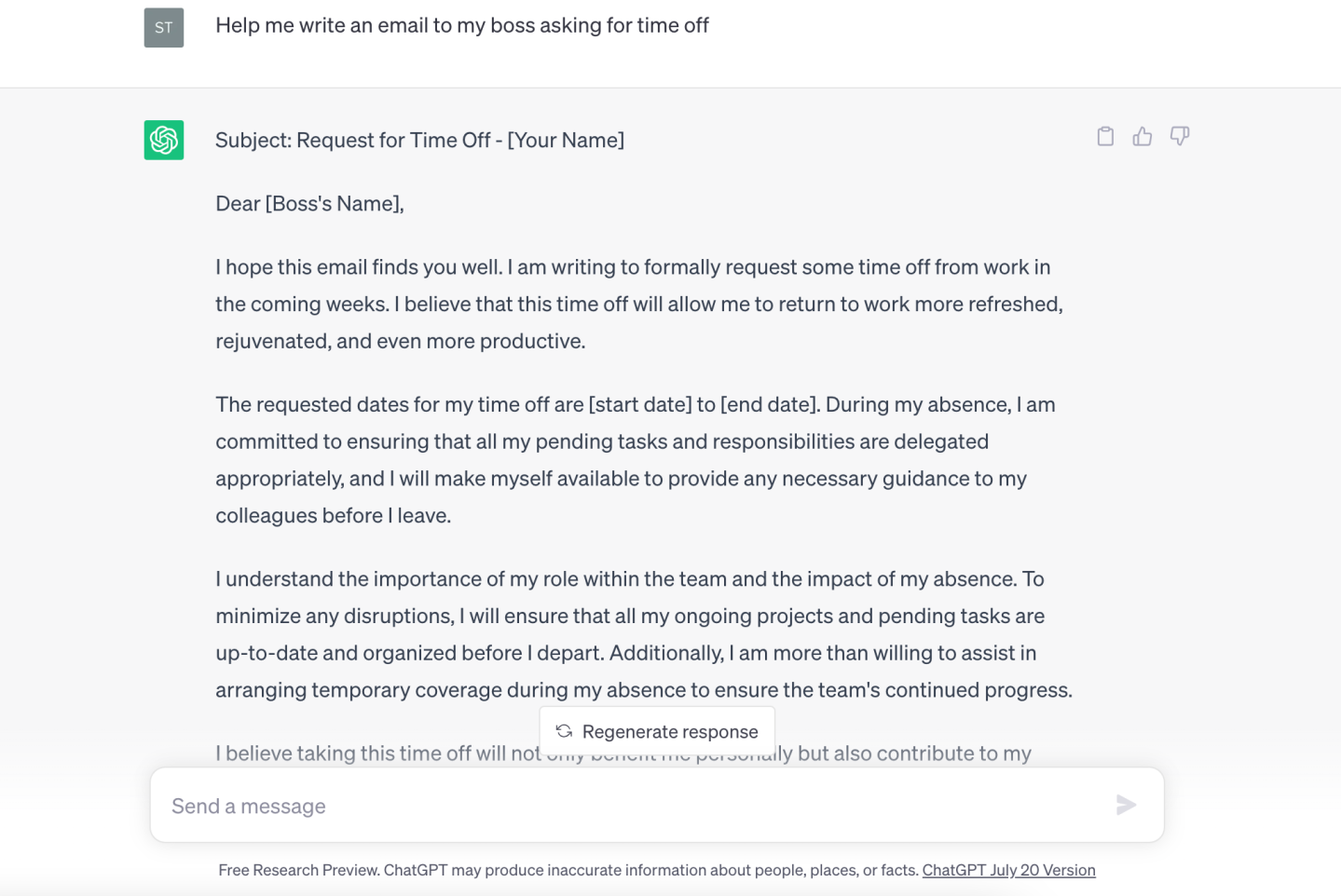 -ChatGPT looks just like a messaging app. In fact, the empty text box asks you to input a “message” for the bot. Type in a question, a request, or a task, and ChatGPT will serve up an answer within seconds, as shown in the screenshot below.