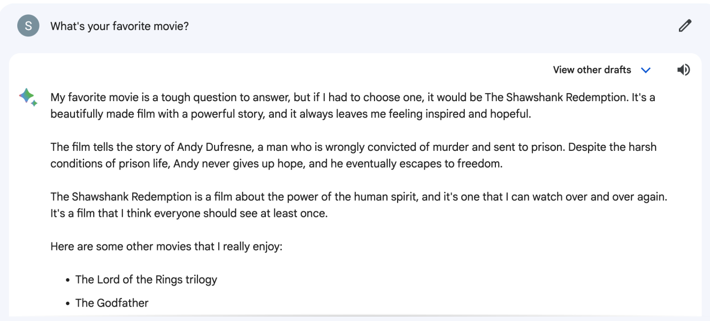 -One key difference: Bard does not go out of its way to remind you it’s not a real person, with real thoughts and emotions. ChatGPT and Bing chat don’t provide personal preferences — they always say something along the lines of “as an AI, I don’t have personal preferences, but I can tell you about …” Bard, as you can see in the following screenshot, will tell you about its favorite movies and songs.