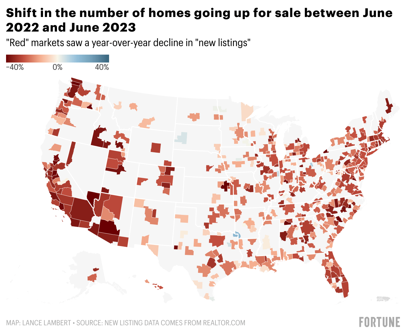 According to Realtor.com, there were 26% fewer U.S. homes listed for sale in June 2023 than in June 2022, and 28.9% fewer than in June 2019.
