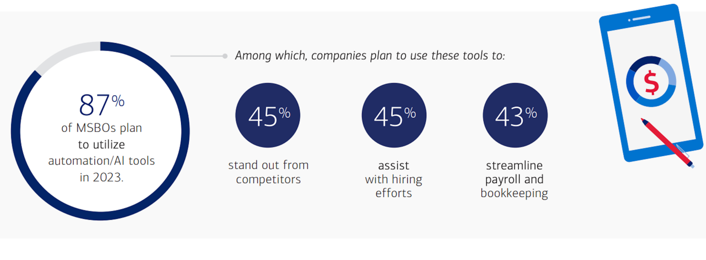 The survey found that 87% of MSBOs plan to further use automation and artificial intelligence to stand out from competitors (45%), assist with hiring (45%), and streamline payroll and bookkeeping (43%). However, 88% view cybersecurity as a threat to their business, and as a result, 65% said they're further investing in digital security systems.
