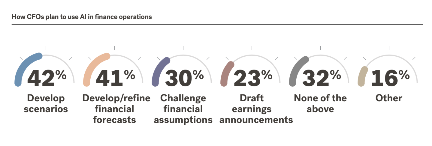 But just 5% of CFOs said generative A.I. will impact finance operations in the next six months, 25% said the impact will happen over the next year, and another 43% over the next two years. Twenty-seven percent said they don’t expect it to have an impact on finance operations in the foreseeable future.