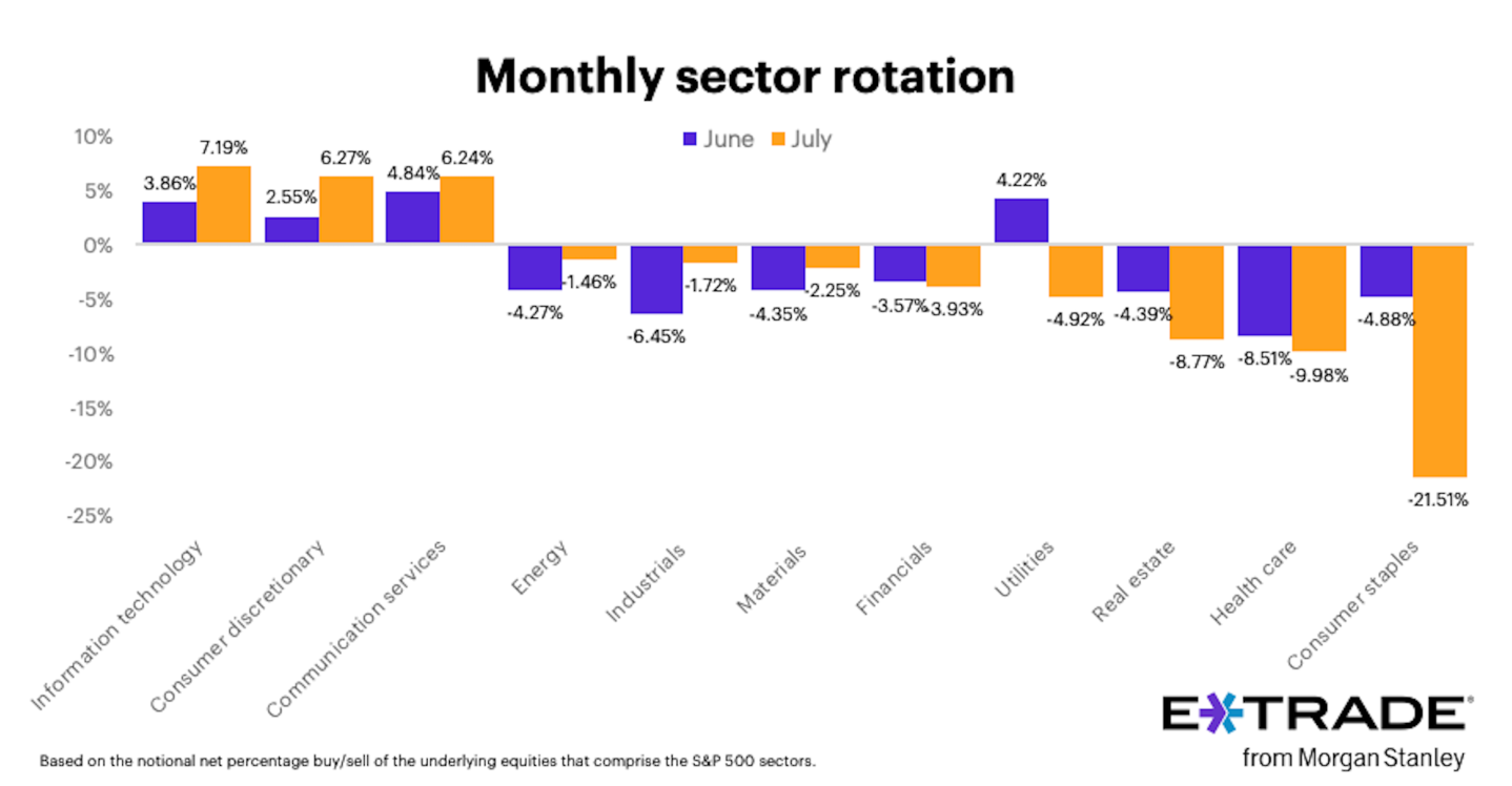 Morgan Stanley’s E-Trade released data from its monthly sector rotation study. The top three sectors in June and July were information technology, consumer discretionary (nonessential goods and services, like cars and entertainment), and communication services. The results are based on the trading platform’s customer notional net percentage buy/sell behavior for stocks that comprise the S&P 500 sectors.