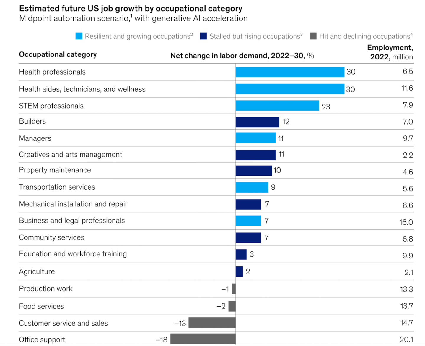 In the U.S., health care is expected to have the largest future job gains. McKinsey estimates that there could be demand for 3.5 million more jobs for health technicians, wellness workers, and health aides, and an additional two million health care professionals. McKinsey also estimates that by 2030, there will be a 23% increase in the demand for STEM jobs, and the transportation services category is expected to see job growth of 9%. But the biggest future job losses are expected in office support, customer service, and food services.