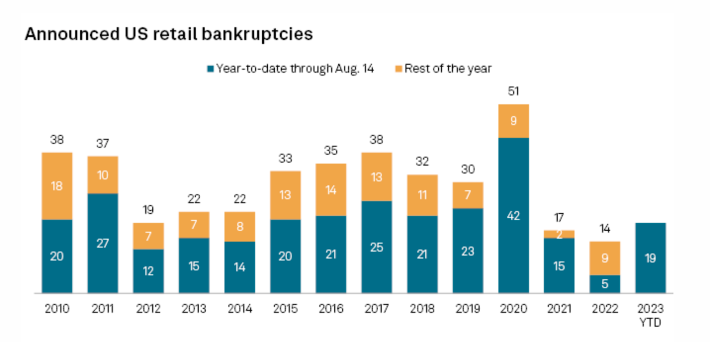 Just a single U.S. retailer, CPI Luxury Group, filed for bankruptcy protection from mid-July through Aug. 14, while default risk ticked slightly lower, S&P Global Market Intelligence research found. So far this year, through Aug. 14, there have been 19 retailers announce bankruptcies, including Bed Bath & Beyond, Inc., David's Bridal, and Rockport Co., according to the report. At the same time last year, there were five retailers who did the same. A total of 14 retailers announced bankruptcies for 2022.