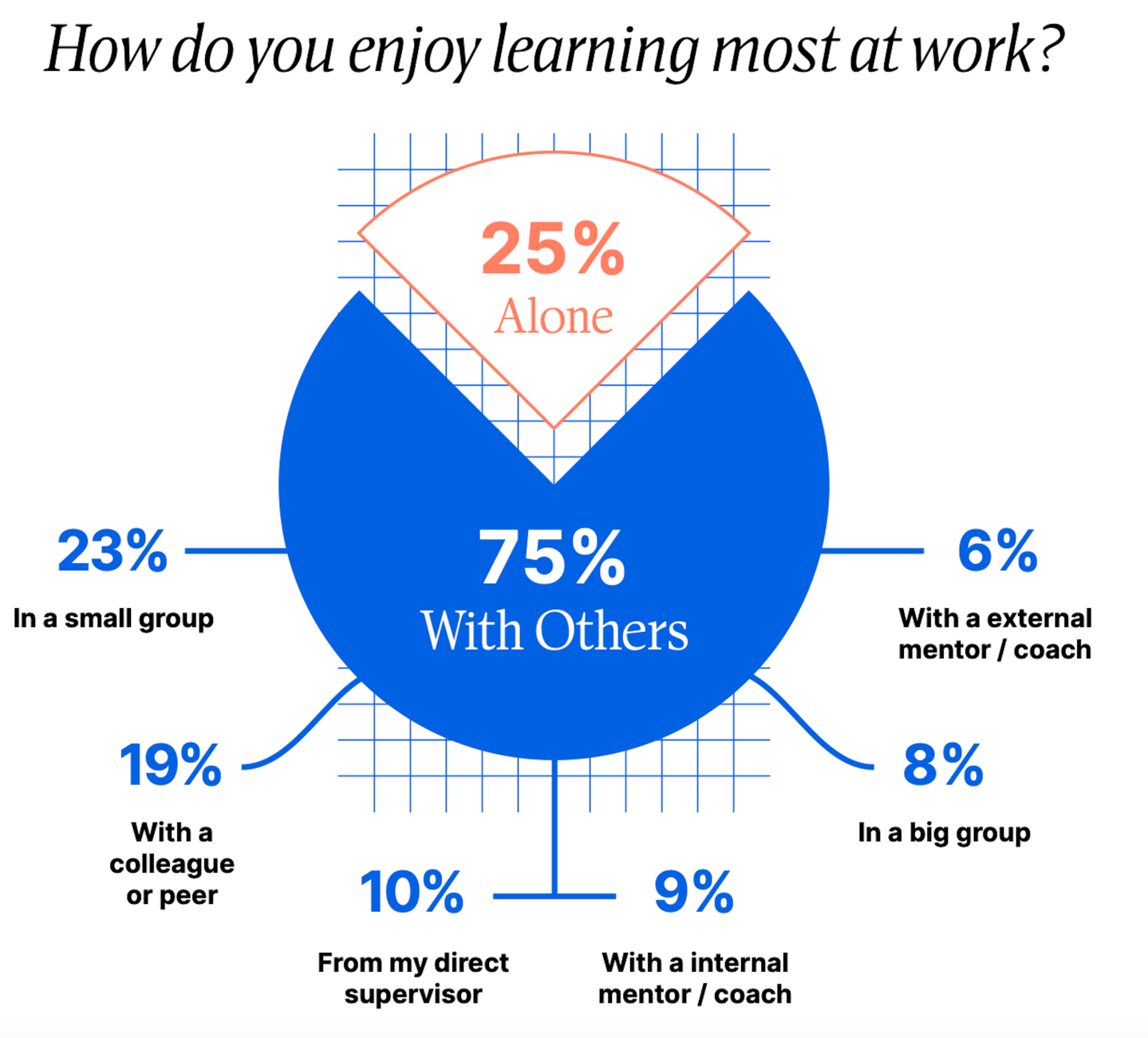 Seventy-five percent of respondents said they enjoy learning the most with some form of social engagement. When learning with others, they especially appreciate a small group (23%) or a one-on-one session with a colleague or peer (19%)."Encourage social learning—whether it’s in person or enabled by learning technologies," Degreed recommends in the report.