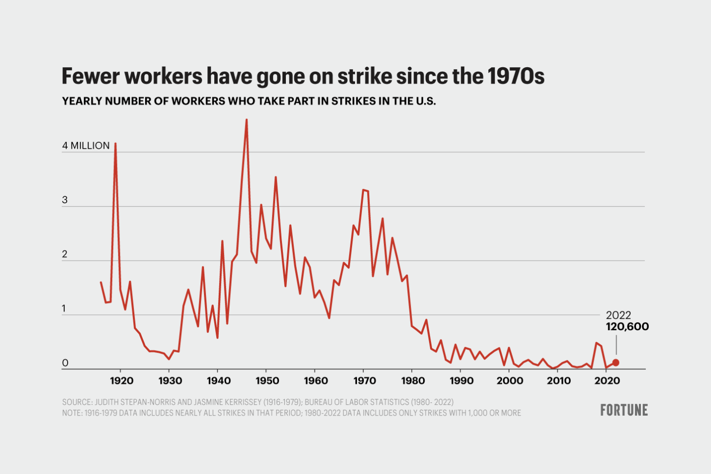 The number of U.S. workers who go on strike in a given year varies greatly but generally follows broader trends. After World War II ended, through 1981, between 1 million and 4 million Americans went on strike annually. By 1990, that number had plummeted. In some years, it fell below 100,000.