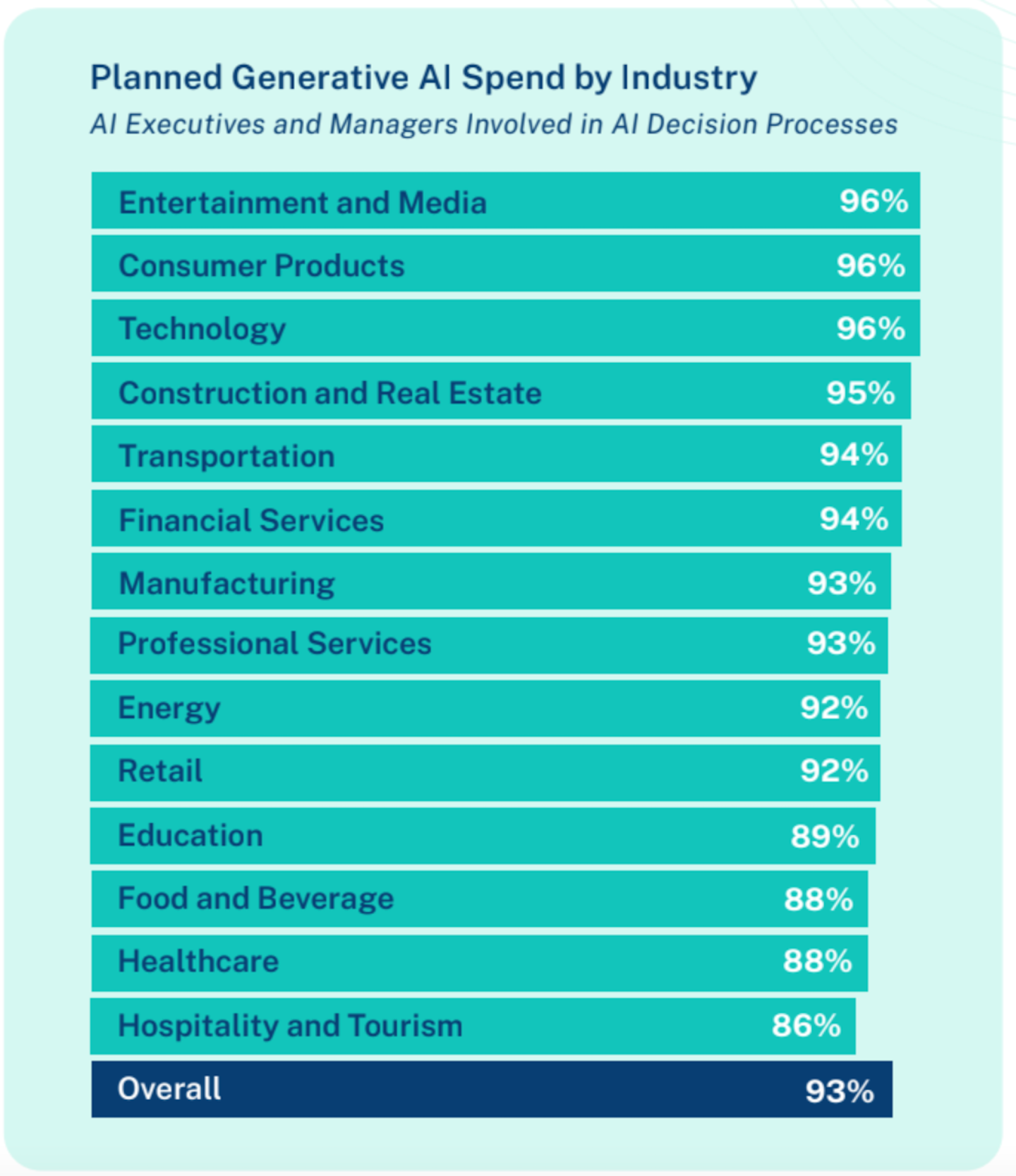 The financial services industry is aligned, with 94% planning to boost generative A.I. investments within the year. However, the survey found differences depending on location. All of the Chinese financial services employees surveyed and 97% of U.K. respondents surveyed said they plan to increase investment, compared to 91% of U.S. companies, according to the report.