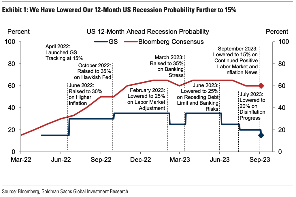 “The continued positive inflation and labor market news has led us to cut our estimated 12-month U.S. recession probability further,” he wrote to clients Monday, noting that 15% is the average recession probability since World War II.