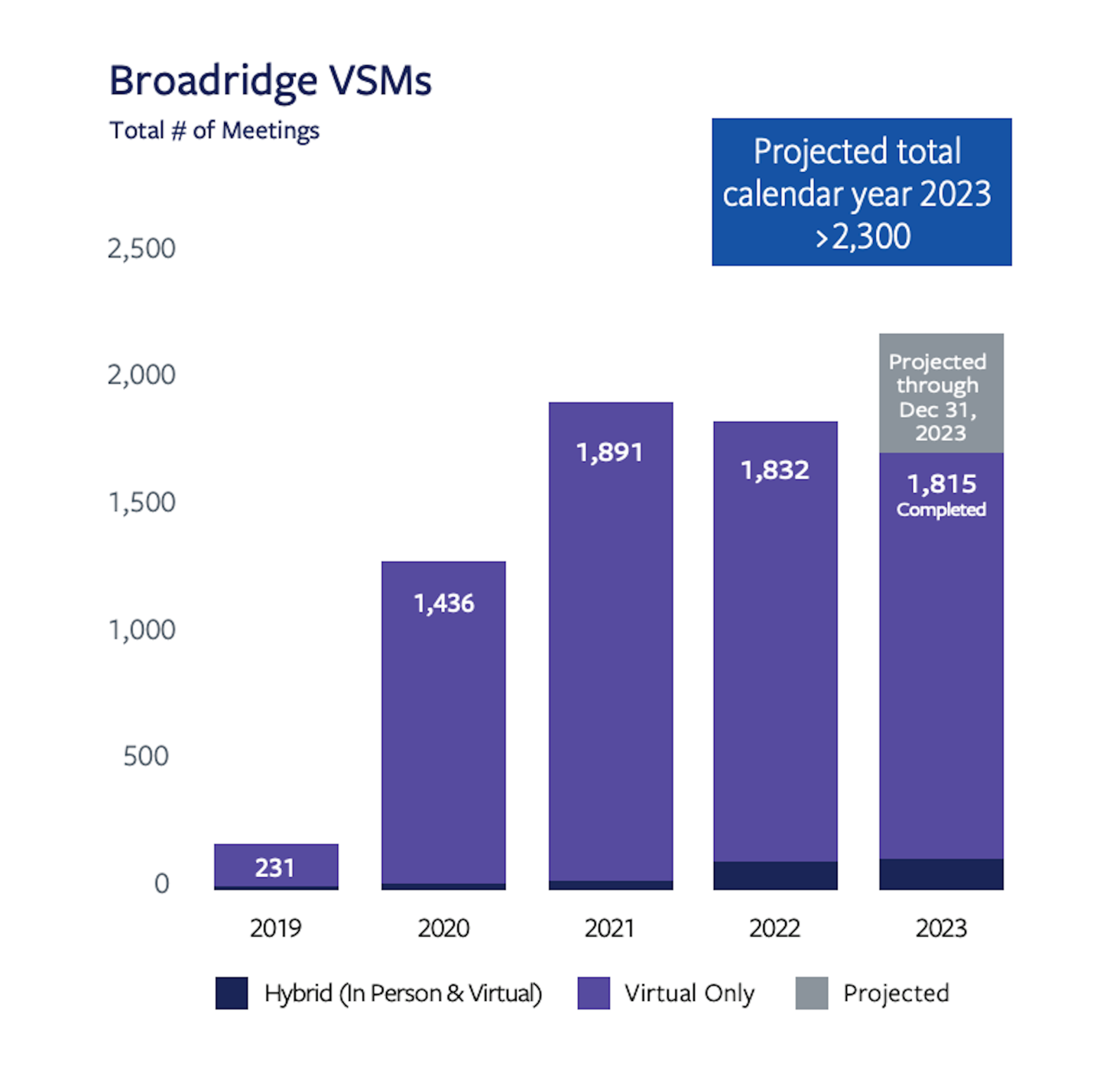 Another key finding is companies and shareholders continue to realize the benefits of online meetings, and technology continues to advance the trend. In the first six months of 2023, there were 1,815 "virtual-only" meetings, close to the all-time highs during the pandemic (1,832 in 2022 and 1,891 in 2021).