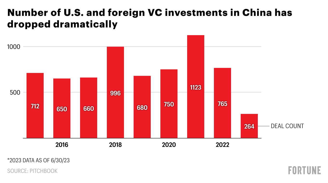 In the last few years, venture capital investments into China from investors based elsewhere have shrunk as Beijing has introduced new challenges for foreign investors and as the U.S. has scrutinized investments in the area. In 2021, there were more than 1,100 deals in China. In the first half of this year, there have only been 264 deals so far, according to PitchBook. The percentage of deals including investors headquartered outside the region—10% of investments into Chinese startups for the first half of this year—is the lowest it’s been since PitchBook started tracking the metric.
