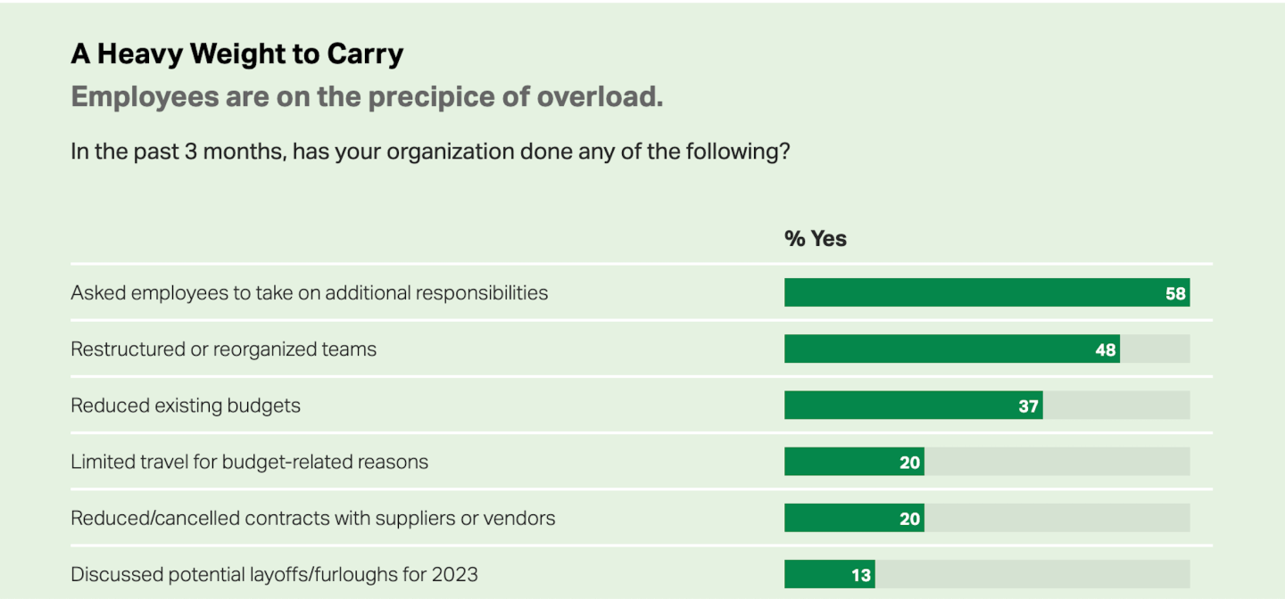 "In a Tight Labor Market, Employees Bear the Burden," a Gallup article, discusses how employers look to their current workforce to fill the gaps of essential job openings that remain unfilled. However, the risk is increased employee stress and burnout. When employees say that their organization has asked them to take on additional responsibilities, they are also 55% more likely to watch for or actively seek a new job, according to the report.