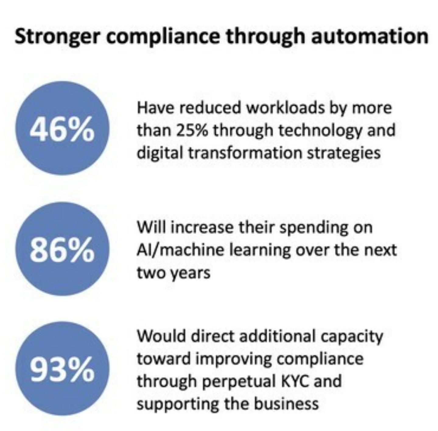 Eighty-six percent of compliance, operations, risk and IT professionals at banks and non-banking financial institutions (NBFIs) surveyed said that over the next two years, they would increase spending on AI and machine learning. Through technology and digital transformation strategies, 46% have reduced workloads by more than 25%, according to the report.