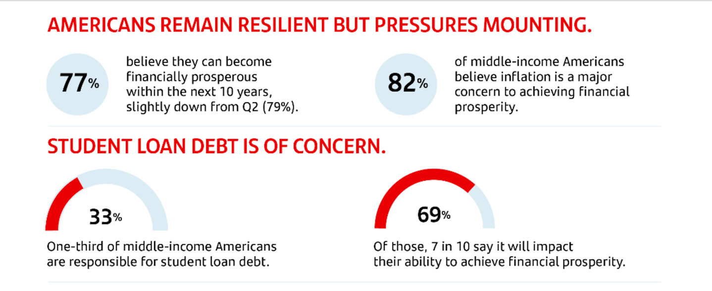 However, prolonged inflation and the resumption of federal student loan payments are clear economic stressors for middle-income households. Seventy-seven percent say they are unable to save as much as a result of inflation, which remained the number one obstacle to achieving prosperity (82%). Meanwhile, 33% of respondents—across all generations—are responsible for student-loan debt, with 69% of this group stating that the resumption of federal student-loan payments is a challenge to achieving financial prosperity.