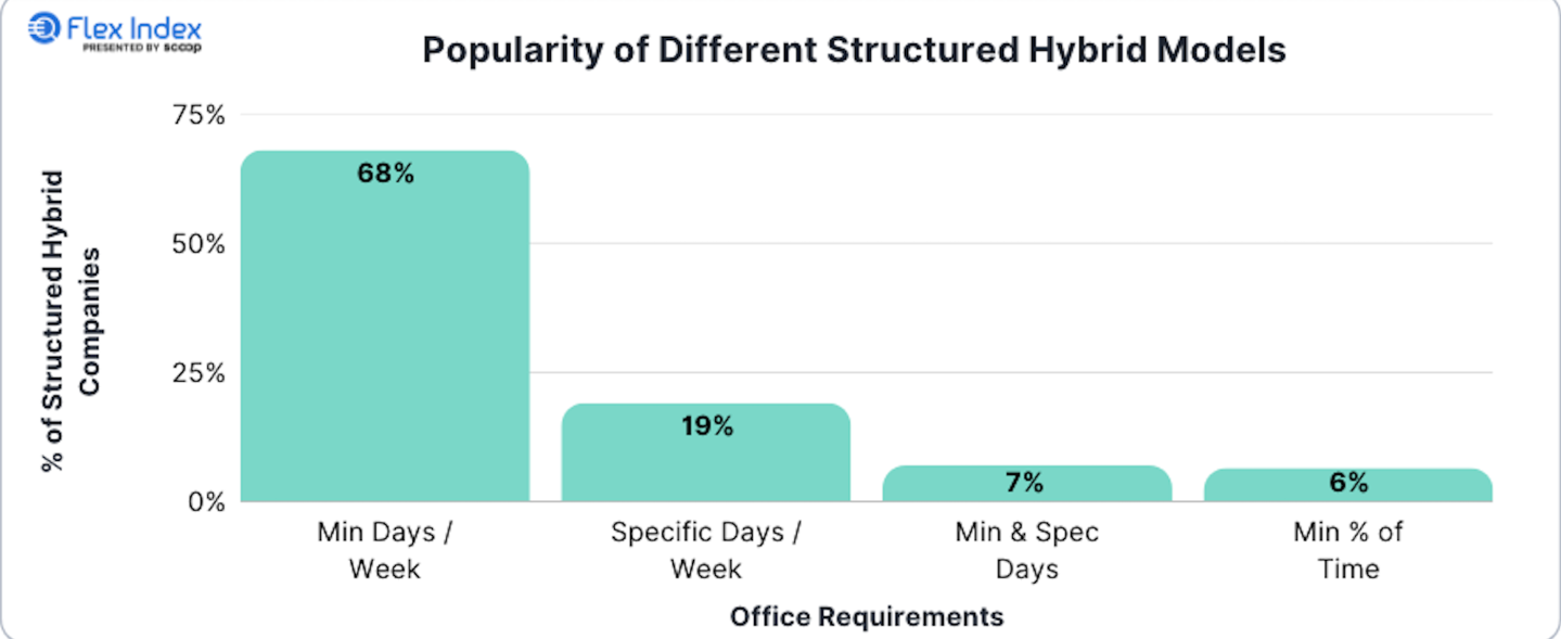 One of the key findings of the research is the popularity of different structured hybrid models for the workplace. Having a requirement of a minimum number of days in the office is the most popular model (68%), followed by a specific days of the week mandate (19%), according to the report.