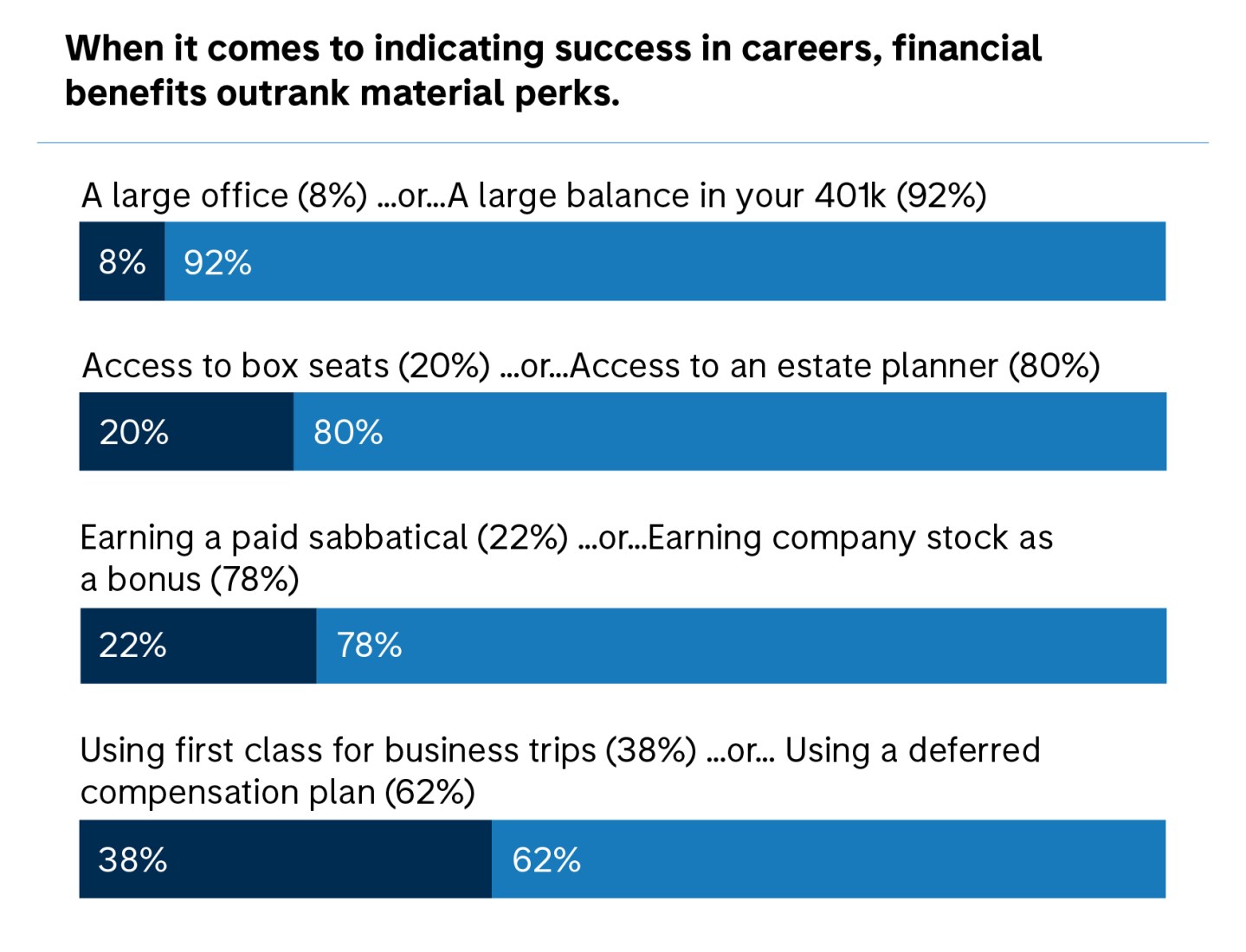 A key finding is what respondents indicate as "success" in their careers, according to data provided to CFO Daily. The majority ranked having a large balance in your 401k (92%) as more important than a larger office (8%), for example. Access to an estate planner (80%), earning company stock as a bonus (78%), and using a deferred compensation plan (62%) were also the top choices.
