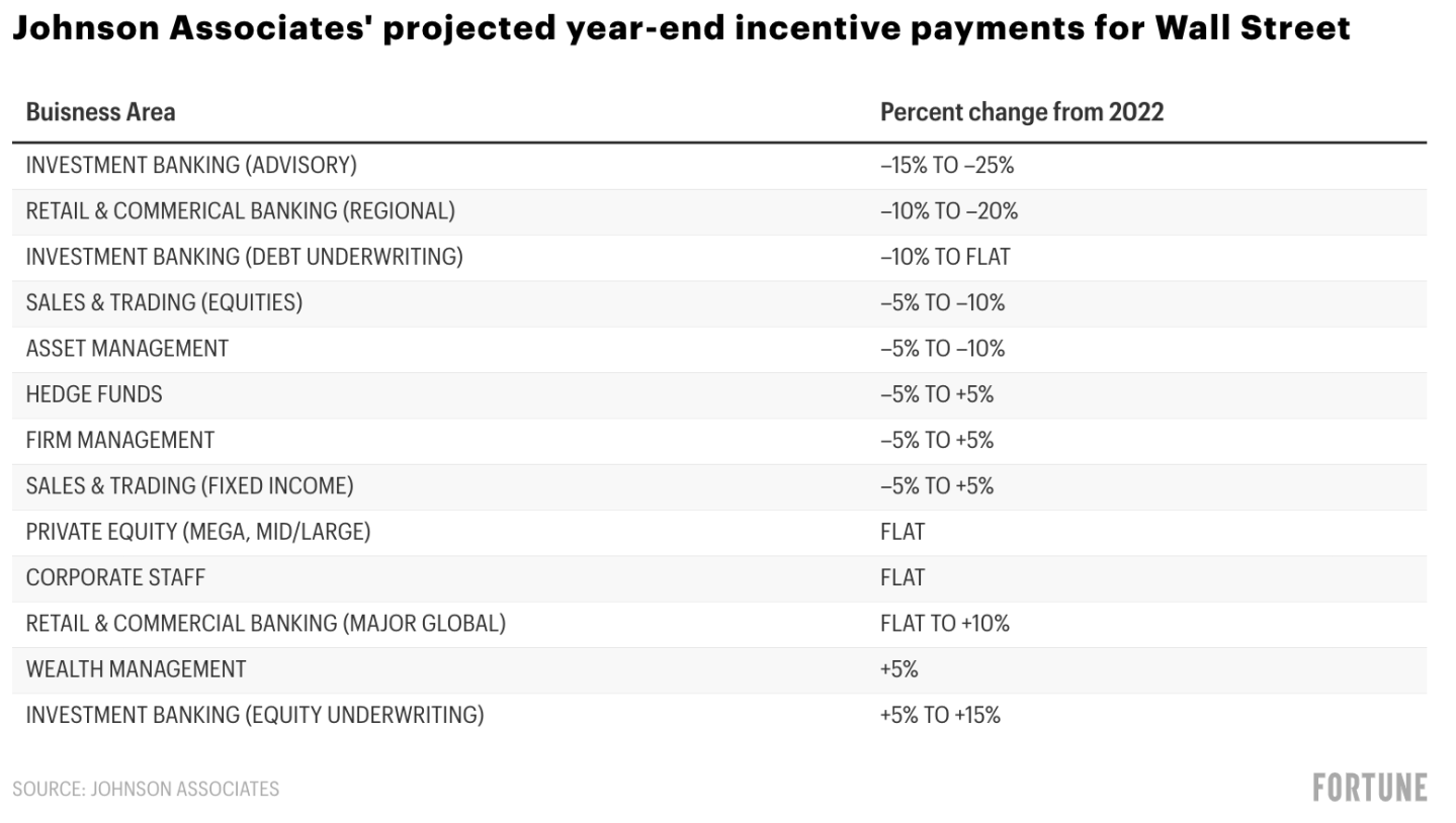 However, Johnson also points to some bonus bright spots. Global retail and commercial bankers are projected to receive awards as much as 10% larger compared to 2022. Investment banking equity underwriters are projected to receive a 5%-15% increase. And wealth management pros are expected to receive up to 5%.