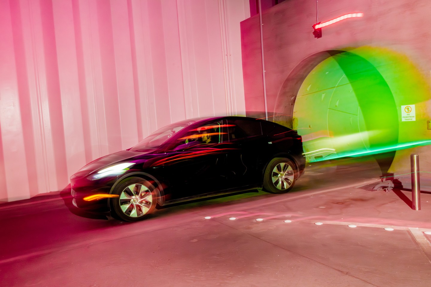 The Vegas Loop project opened in June 2021 at Boring’s central station. A slew of media were invited to descend an escalator into a neon-lit 10-stall station (which Hill estimates cost the Boring Company $20 million to $30 million) and take their first ride. In the station, a Boring Company employee ushers riders into an available Tesla vehicle, and a Boring driver chauffeurs them through the narrow, single-lane tunnels at a speed of up to 40 miles per hour. The tunnels are white-walled, 12 feet wide, and feature funky pink, blue, and green lights.