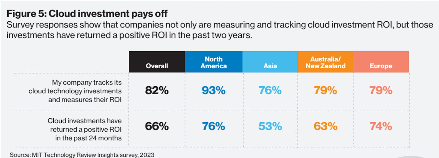 One of the key findings of the report is regarding return on investment (ROI). Overall, a majority of respondents (82%) say they measure the success of these cloud investments by determining ROI. At the same time, only (66%) report positive ROI in the last two years. Challenges remain for most firms mapping out cloud spending for business-line profitability. A higher percentage of respondents in North America (76%) and Europe (74%) report positive ROI in the past 24 months.