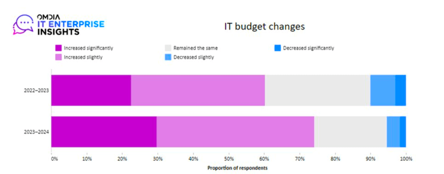 The 10th annual IT Enterprise Insights study released by Omdia, a technology research and advisory group, found that IT has become one of the main drivers of value to a company. Almost three-quarters (74%) of senior IT executives confirmed increases to their overall budget allocated to enterprise IT in 2023, compared to 62% in 2022. The top business priority is increasing operating efficiency, while the top IT priority is managing security, identity, and privacy.