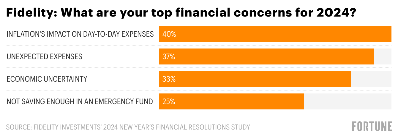 Forty percent of respondents said inflation is their top financial concern for 2024. More Americans, overall, look to prioritize long-term savings goals next year. Three in four Americans worry about cost-of-living increases having an impact on their budget. Most respondents (81%) say they plan to build up their emergency savings in 2024. However, about a quarter of respondents also worry they will not be able to save enough in an emergency fund.