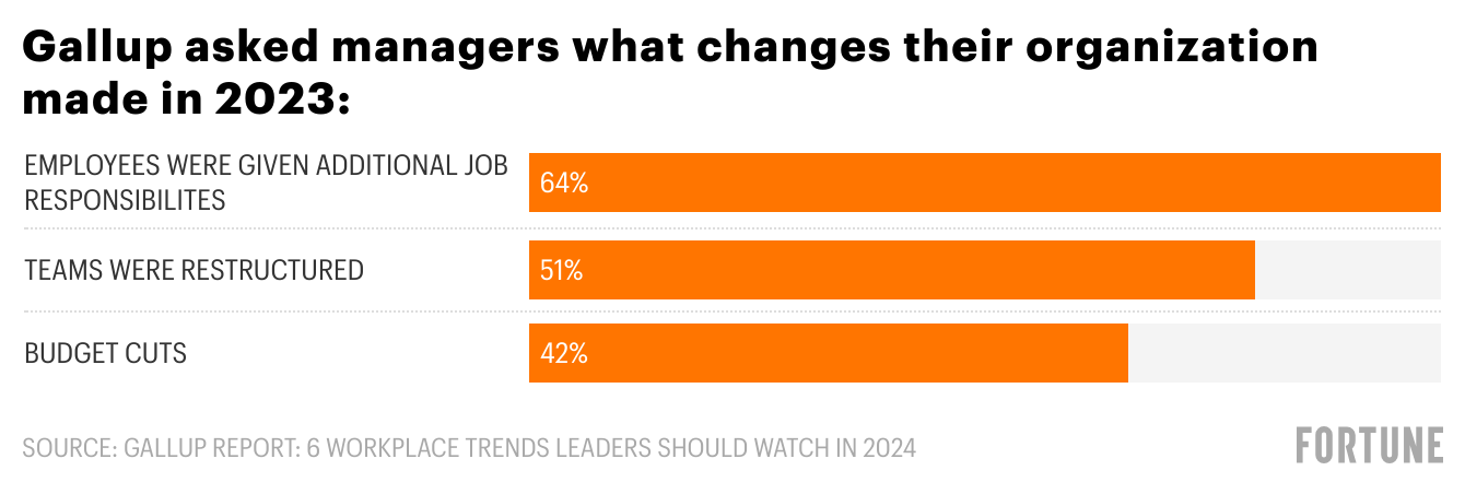 In 2024, leaders should consider re-tooling their management strategies to better support the changing needs of their workforce, according to Gallup. When asking managers the changes their organizations made this year, 64% said additional job responsibilities were given to employees. Gallup offers six trends that leaders should be paying attention to within their own organizations, such as global worker stress remaining at a record high, according to the report.