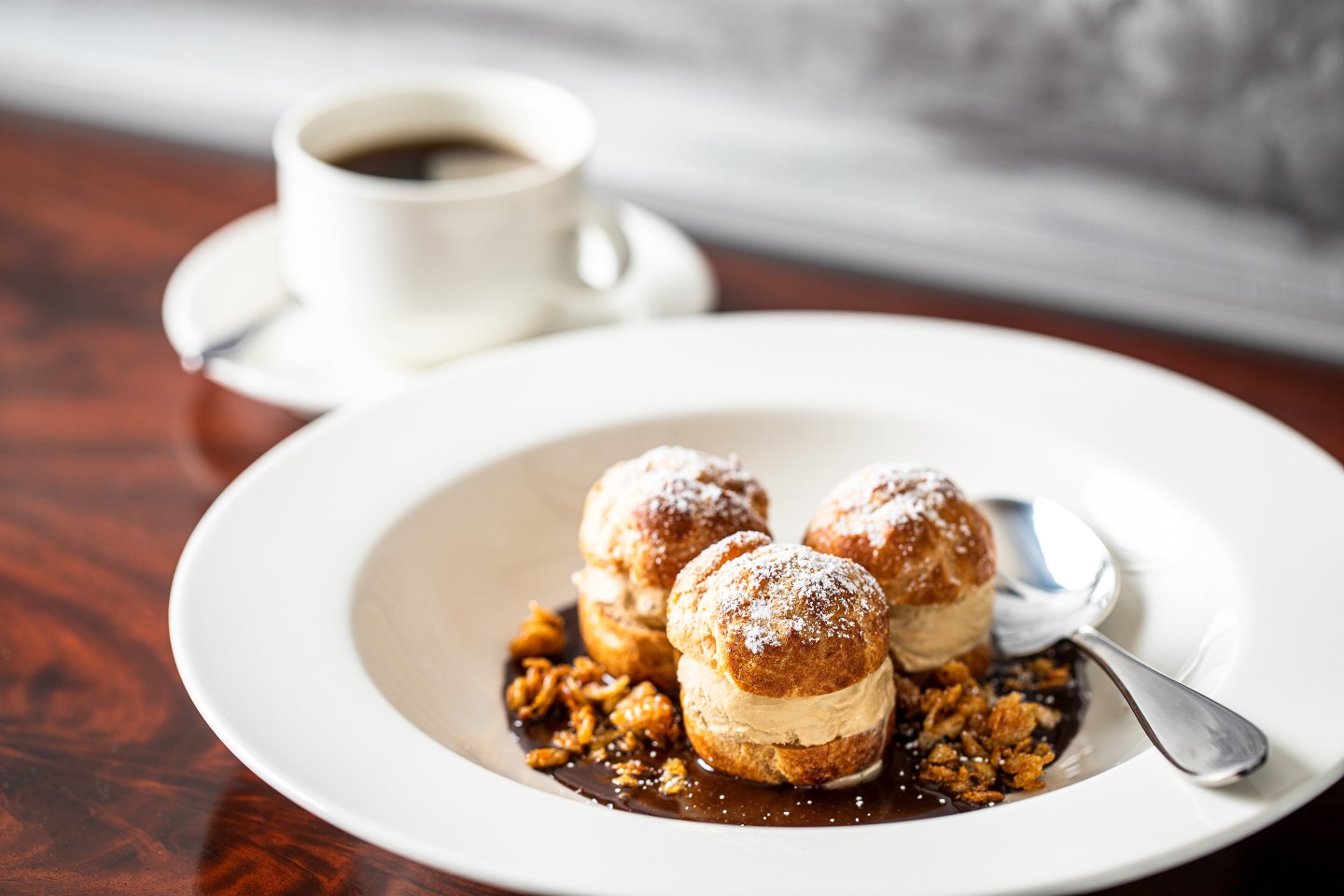 Recent seasonal dishes include vegetable scampi with linguini, slipstream farm mushrooms, broccolini, garlic, parmesan, and meyer lemon zest; the Left Bank burger with a short rib blend, brie, shallot jam, and bordelaise sauce, served on a farmhouse bun with truffle fries on the side; and espresso crème brûlée with a scoop of egg nog ice cream. The Left Bank also offers room service and à la carte breakfast for guests, with plans to launch brunch in 2024.