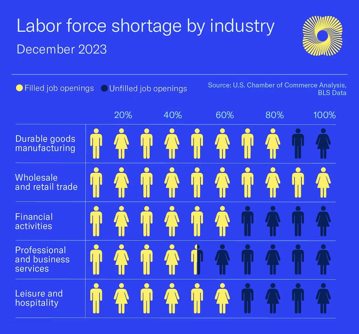 Understanding America’s Labor Shortage: The Most Impacted Industries, a report by the U.S. Chamber of Commerce, explores how a significant number of positions still remain unfilled, especially in the professional and business service sector.