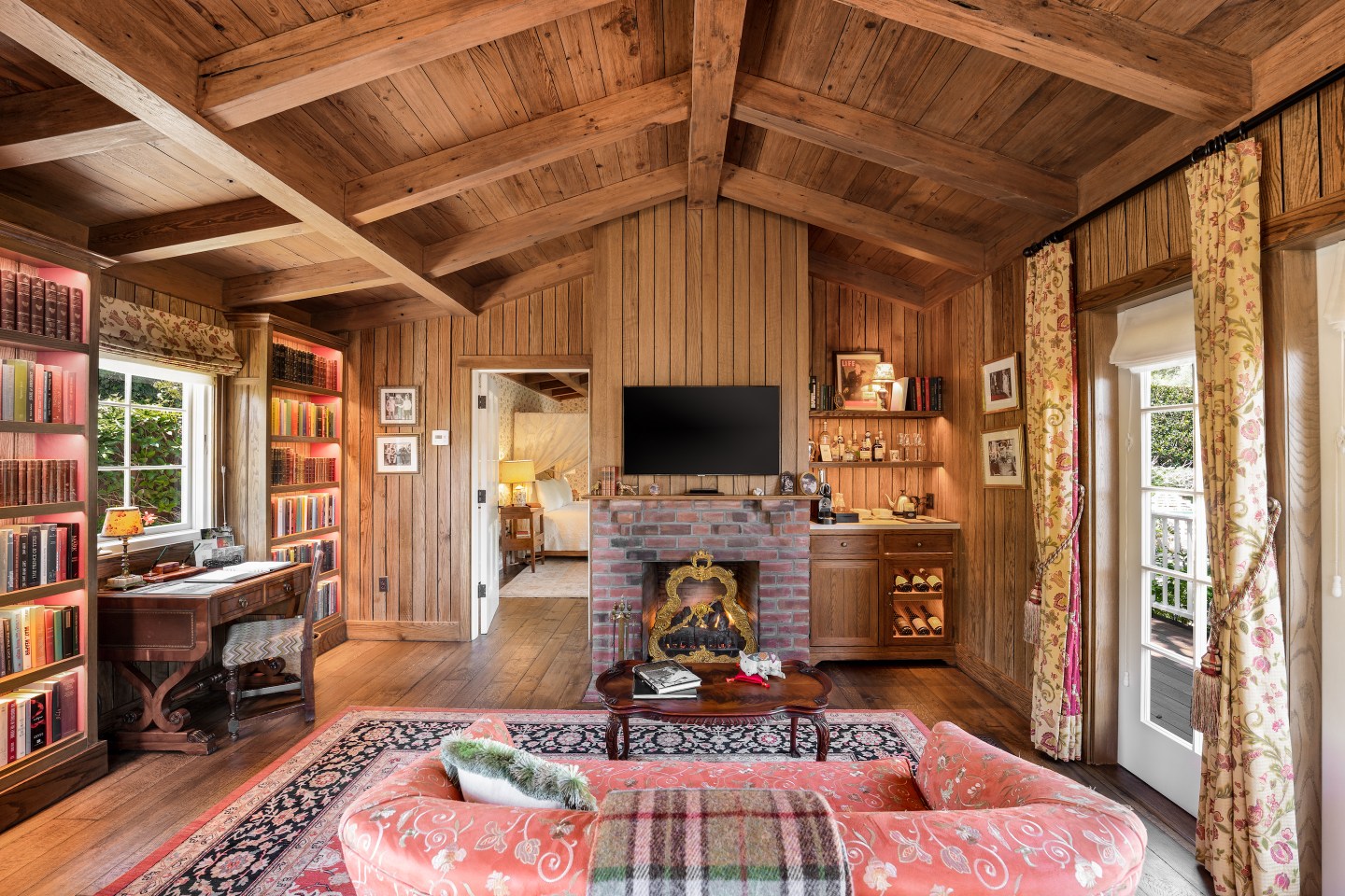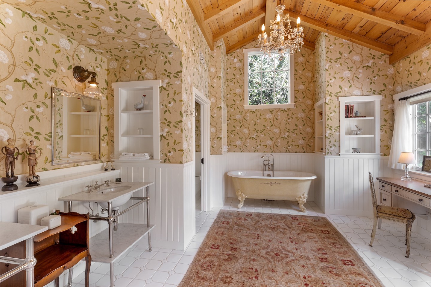 No room is exactly the same at San Ysidro Ranch, and every single one of the 38 bungalow-style cottages is bespoke. The bathroom wallpaper, for instance, is actually fabric turned into wallpaper, even installed all the way up the ceilings of the A-frame above the shower. (The crew that works on the wallpaper also has experience in the White House.)