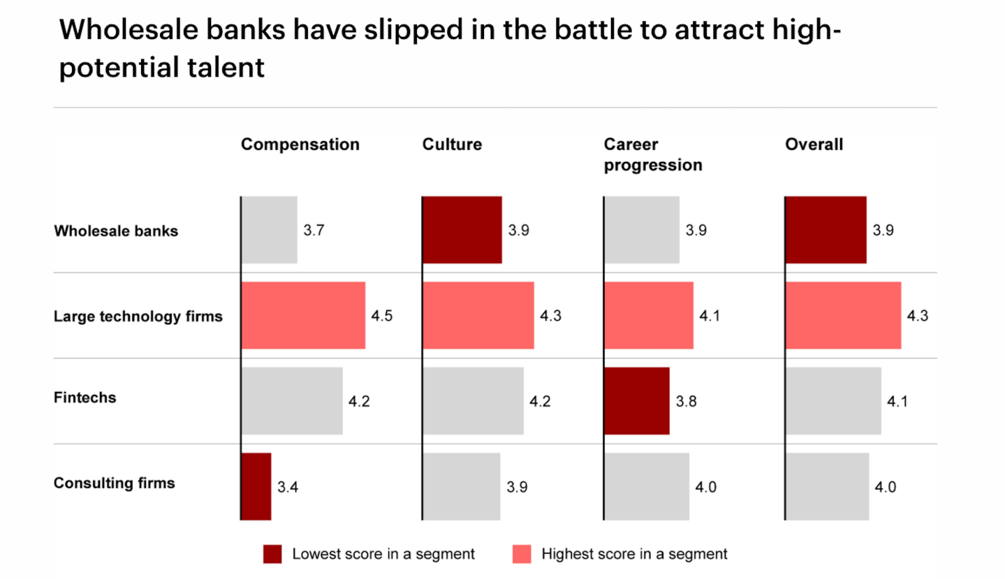 Wholesale banks received the lowest overall score for compensation, culture, and career progression. Large technology firms received the highest overall score. Employees and recruits increasingly want a hybrid home-and-office work model, including purposeful work with learning opportunities.