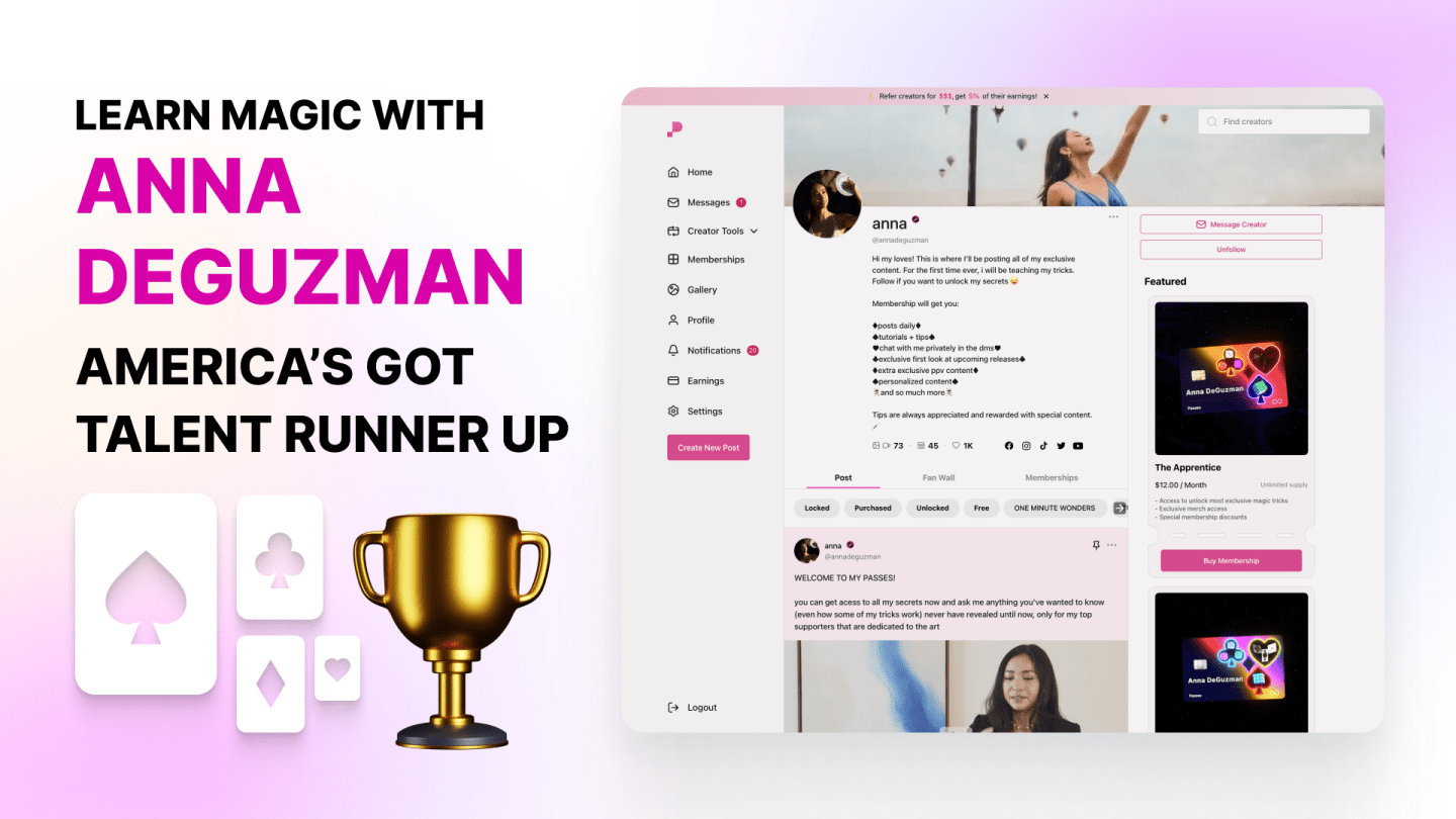 Passes supports 900 creators and 500,000 fans, Guo told Fortune. Some of its most popular users include America’s Got Talent runner-up and magician Anna DeGuzman, workout influencer Alysia Magen, and relationships therapist Jeff Guenther. The top 10 creators on Passes are on track to earn more than $1 million this year, Guo said. The company earns money by charging 10% plus a 30-cent transaction fee on each payment. Guo would not disclose Passes’ revenue.