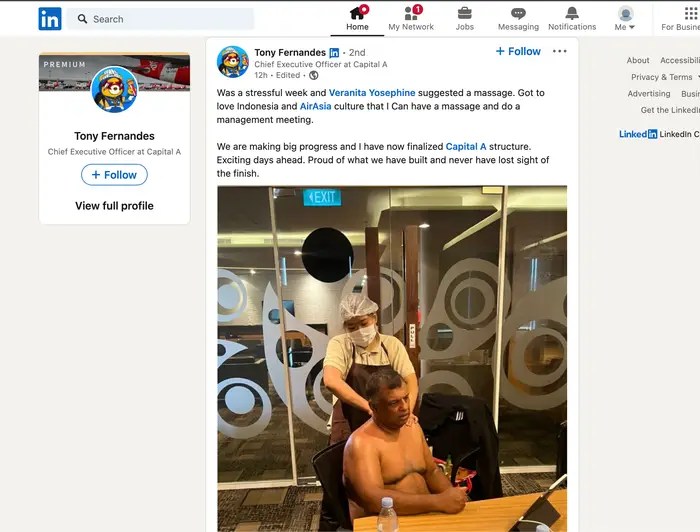 Picture this: You’ve had a stressful week at work, so you take up a colleague’s suggestion to whip your top off and get a massage during the management meeting—and then post a snap of the indulgent moment on LinkedIn. The scenario sounds almost too bizarre to be true, but it’s exactly what AirAsia’s CEO Tony Fernandes did last October—and he has zero regrets.