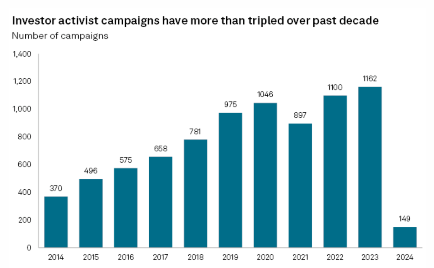 In fact, new data released by S&P Global Market Intelligence finds that investor activism hit a record high in 2023. Last year, there were 1,162 activist campaigns, up from 1,100 a year earlier and 370 campaigns in 2014, according to the report.