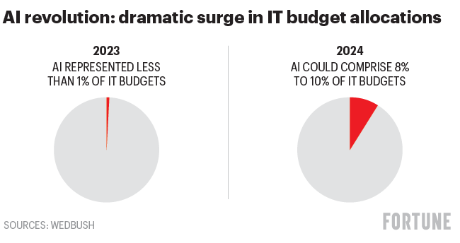 “We believe overall AI could comprise 8%-10% of IT budgets in 2024 versus less than 1% in 2023,” Wedbush proclaims.