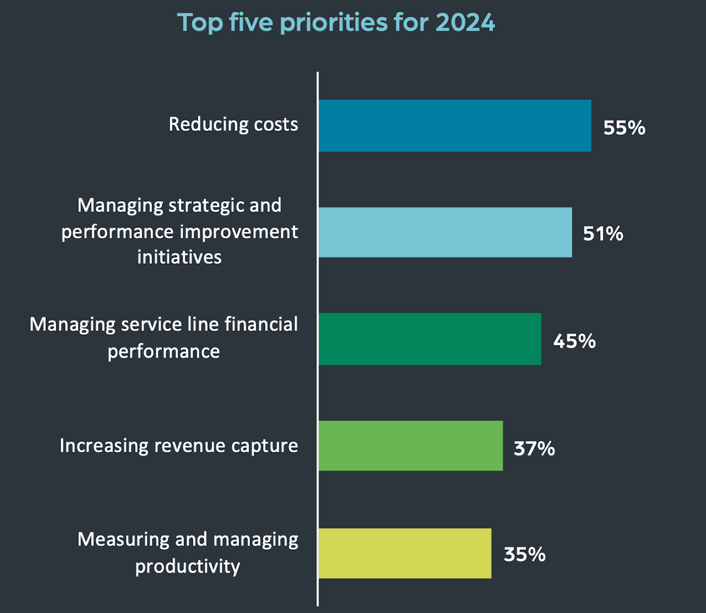 However, high costs remain a concern for many. Survey respondents cited contract labor and employed labor as their biggest unforeseen costs for 2023, according to the report. This year, reining in costs is a top priority for 55% of health care leaders, followed by managing strategic and performance improvement initiatives (51%), and managing service line financial performance (45%).