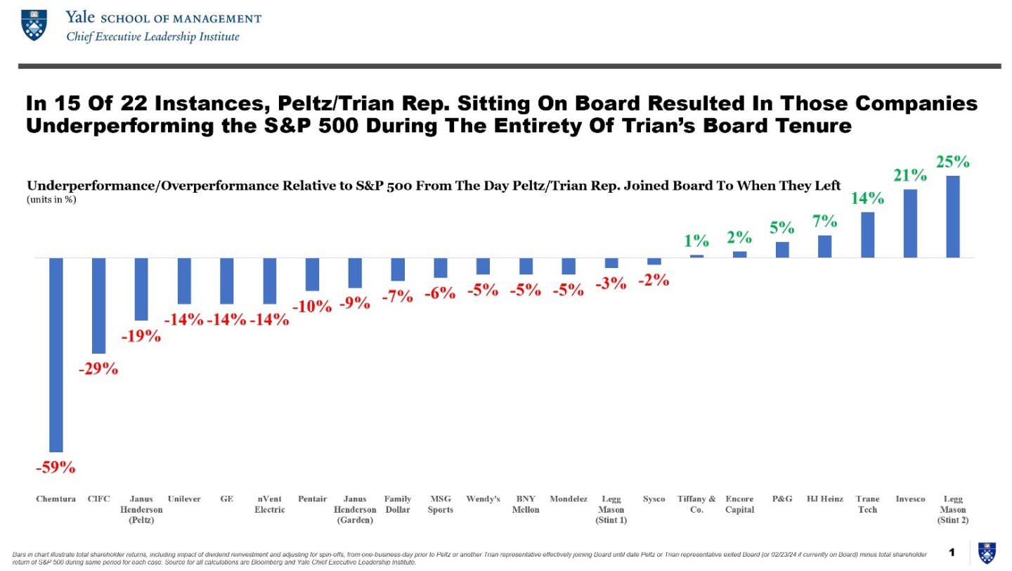 If we measure performance from when Peltz or a Trian partner joined the board to when they leave, the companies Trian has been involved with have actually underperformed the S&P by -6% annually, on average. As we were the first to reveal a year ago, with others such as Disney and The Wall Street Journal subsequently corroborating our analysis, across 22 total instances where Peltz or a Trian representative sat on a board, 15 of those instances, or roughly 70% of his board intrusion, resulted in those companies underperforming the S&P 500 during the entirety of Trian’s tenure.