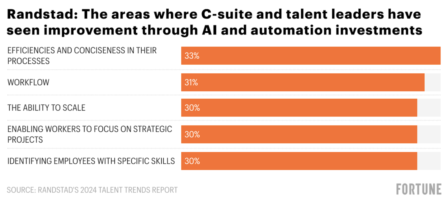 One of the key findings pertains to AI. For many of the respondents, the benefits of the technology outweigh the risks. Overall, 78% say AI can effectively identify opportunities for internal mobility. In comparison, 78% also believe AI is capable of finding needs and gaps within their workforce, which can be an advantage when transforming into a skills-based organization, according to the report. The areas where respondents have seen improvement through AI and automation investments include efficiencies and conciseness in their processes (33%) and workflow (31%).