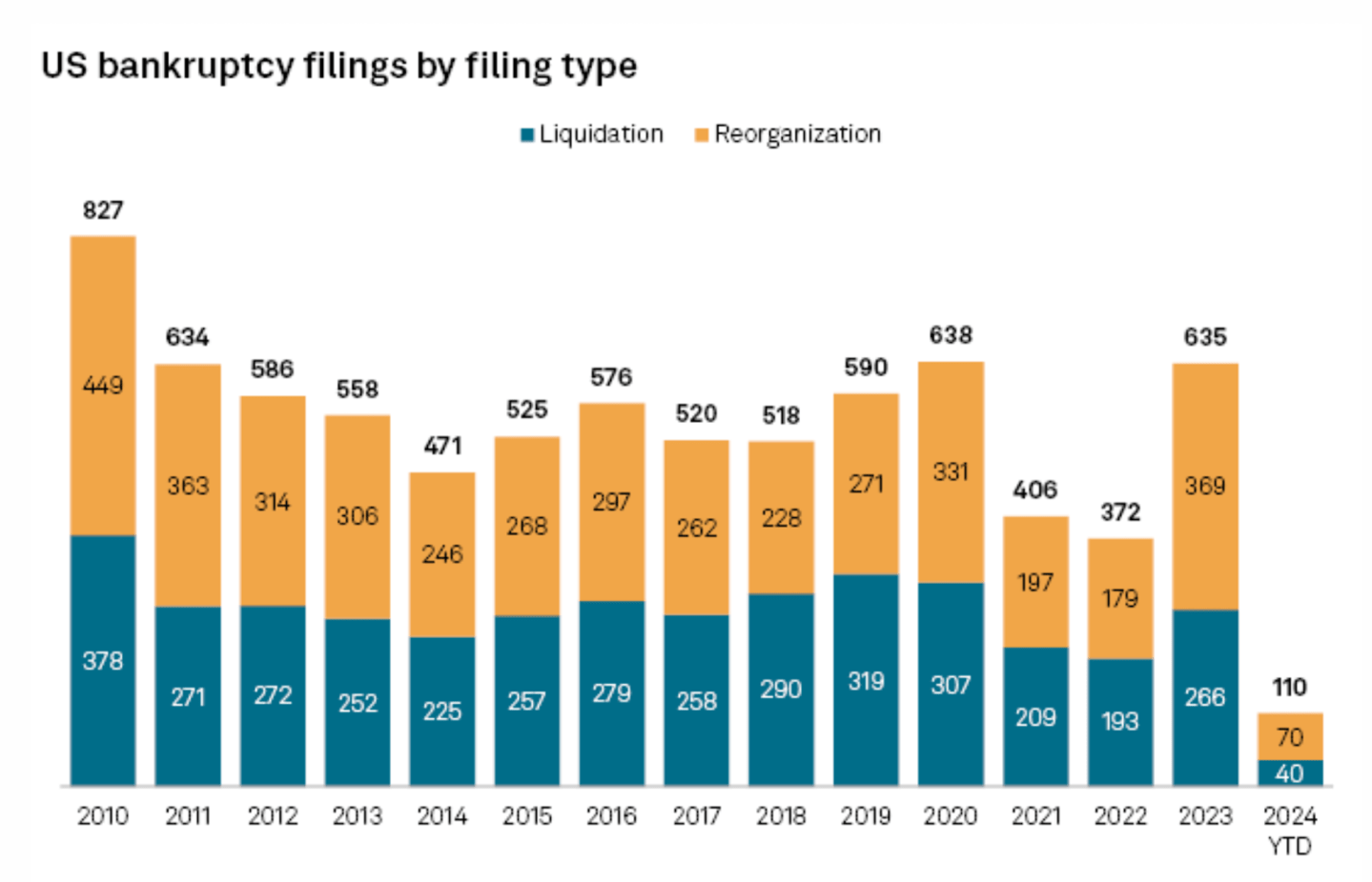 An S&P Global Market Intelligence report finds that reorganization is becoming a more popular option for U.S. companies seeking to address their financial challenges through bankruptcy. In 2023, compared to any other year since 2010, a greater proportion of companies pursuing bankruptcy opted to reorganize instead of liquidate, according to the report.