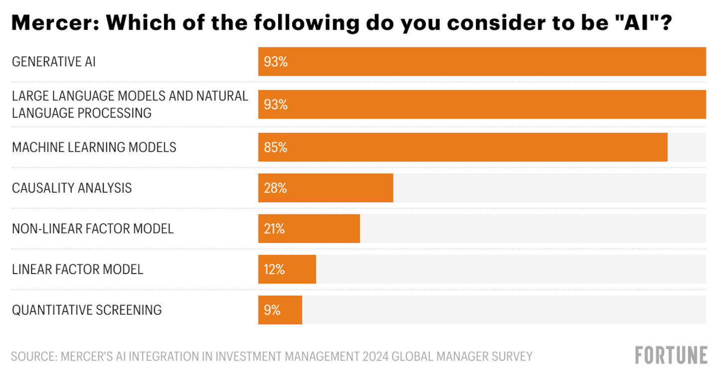 Mercer Investments' AI integration in investment management 2024 global manager survey provides insights on AI adoption. The survey included 150 asset management managers from various asset classes. Ninety-one percent of managers are currently (54%) or planning to (37%) use AI within their investment strategy or asset class research.