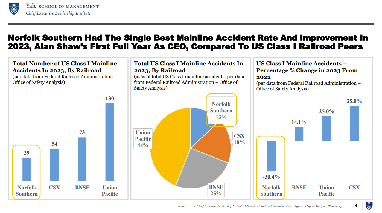 The data clearly shows that Shaw’s safety improvements are working. As we show here in our comprehensive original analysis, according to datasets from the Federal Railroad Administration, in 2023, compared to U.S. Class I railroad peers, Norfolk Southern was the single safest railroad in the nation with the lowest total number of mainline accidents, and the greatest percentage drop in accidents from the year before. So far in 2024, Norfolk Southern has sustained that progress as the single safest railroad.