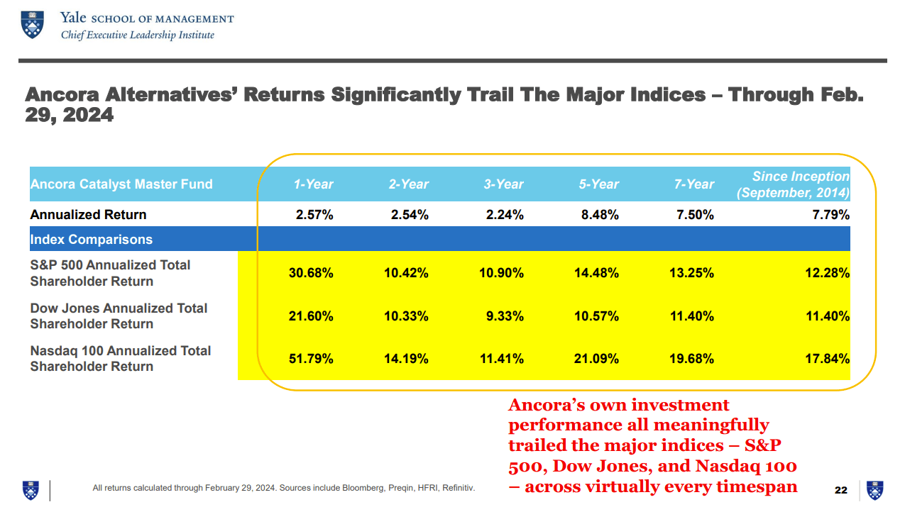Not only has Ancora lost many of its proxy fights, but even more importantly, Ancora’s investment returns in its Ancora Catalyst Master Fund have dramatically underperformed all major indices (S&P 500, Dow Jones, and Nasdaq 100) and even Norfolk Southern stock itself across virtually every time span we measured, as we detail in our more comprehensive slide deck here. In fact, an investor could have generated stronger investment performance from low-yielding government bonds than Ancora’s returns.