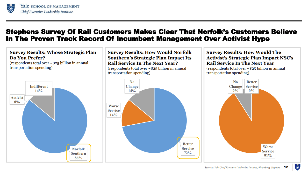 But evidently, to many Norfolk Southern stakeholders, the problem is actually Ancora’s own activism leader, Jim Chadwick. In a recent Stephens customer survey of dozens of rail customers representing over $25 billion in annual transportation spending, when asked “Whose strategic plan do you prefer”, an overwhelming 86% of respondents selected Alan Shaw’s, 14% were indifferent, and 0% preferred the activist’s. Some 91% of respondents believed that Ancora’s strategic plan would make Norfolk Southern’s rail service worse in the next year, while 0% believed it would get any better. Not exactly an inspiring show of support for Ancora from Norfolk Southern’s key customers, who know you can’t “train on the job.”