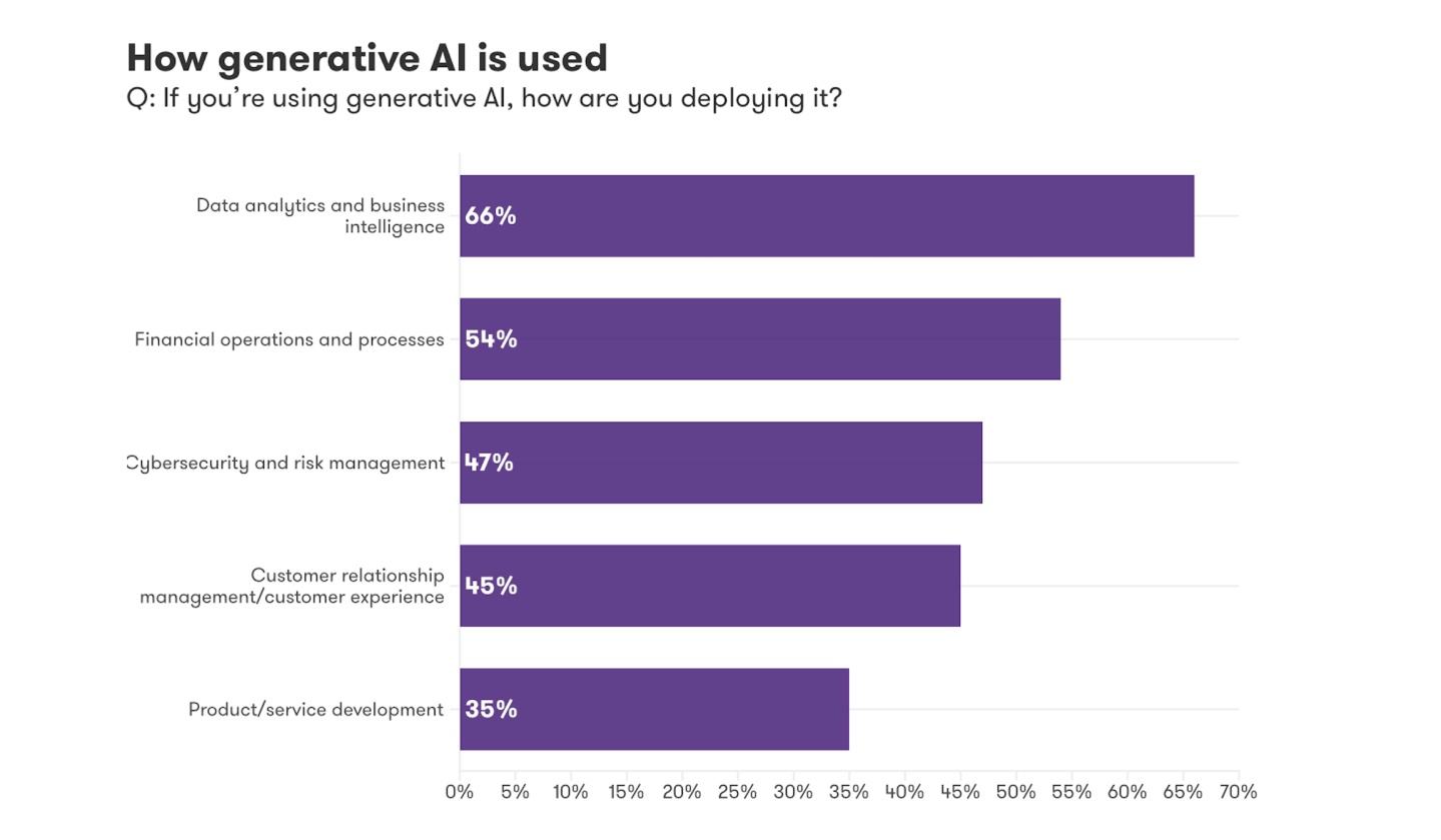 One of the key findings of the report is 52% of CFOs expect to increase spending in sales and marketing investments—the highest response for this category since the first quarter of 2021. The survey, based on 273 senior finance leaders, also finds that CFOs are prioritizing technology enhancement in their financial operations and processes. AI is being deployed most for data analytics/business intelligence (66%), followed by financial operations and processes (54%).