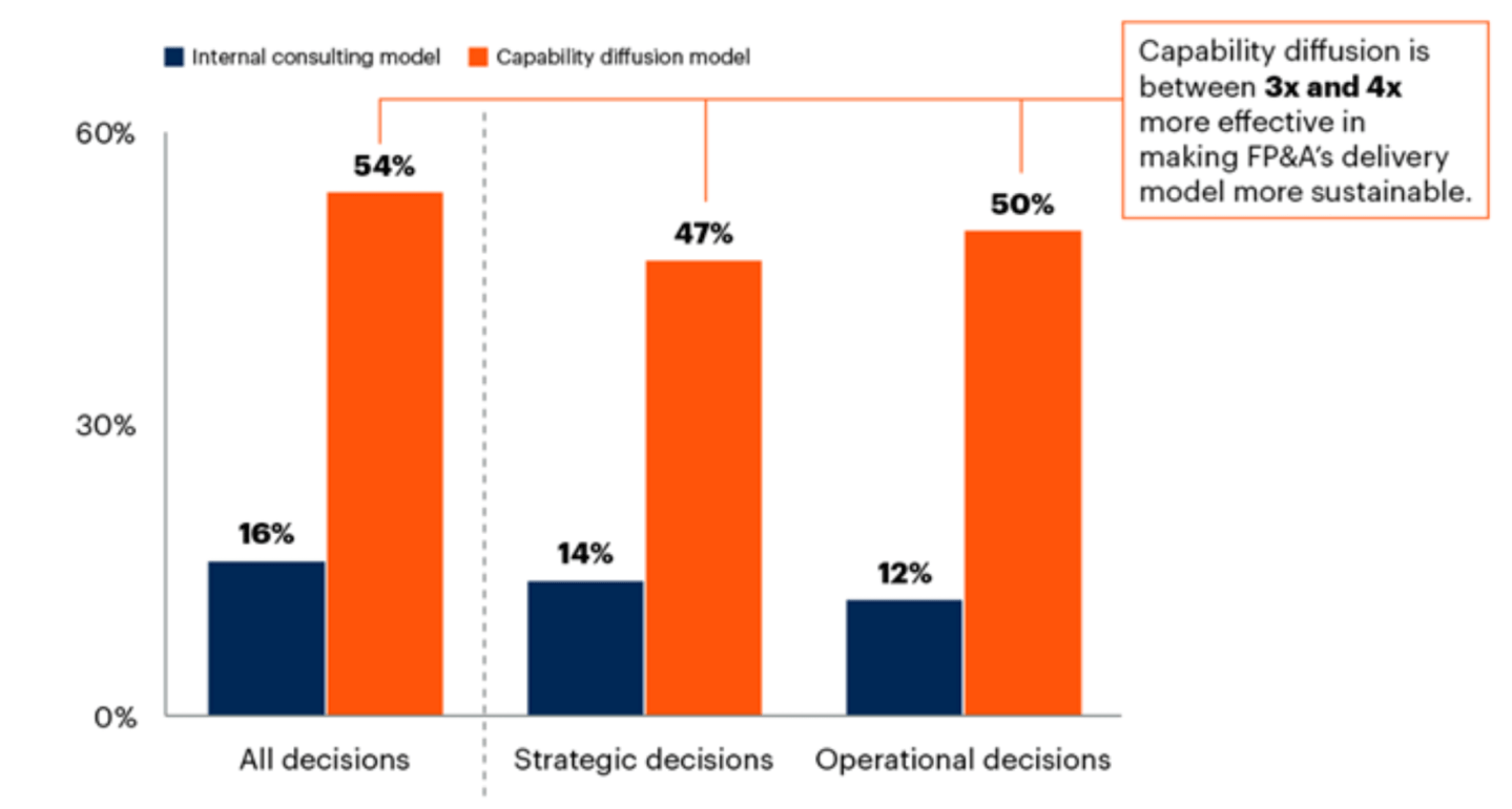 However, leading FP&A organizations have discovered a scalable way for FP&A to deliver value-added insights to the company by using a “capability diffusion model,” according to the report. In this model, technology is the “default channel” for providing decision support. That means using FP&A decision support that is embedded into technology tools and in-person business partnering is the exception. Gartner finds that the capability diffusion model is more sustainable for FP&A teams to keep up with demand.