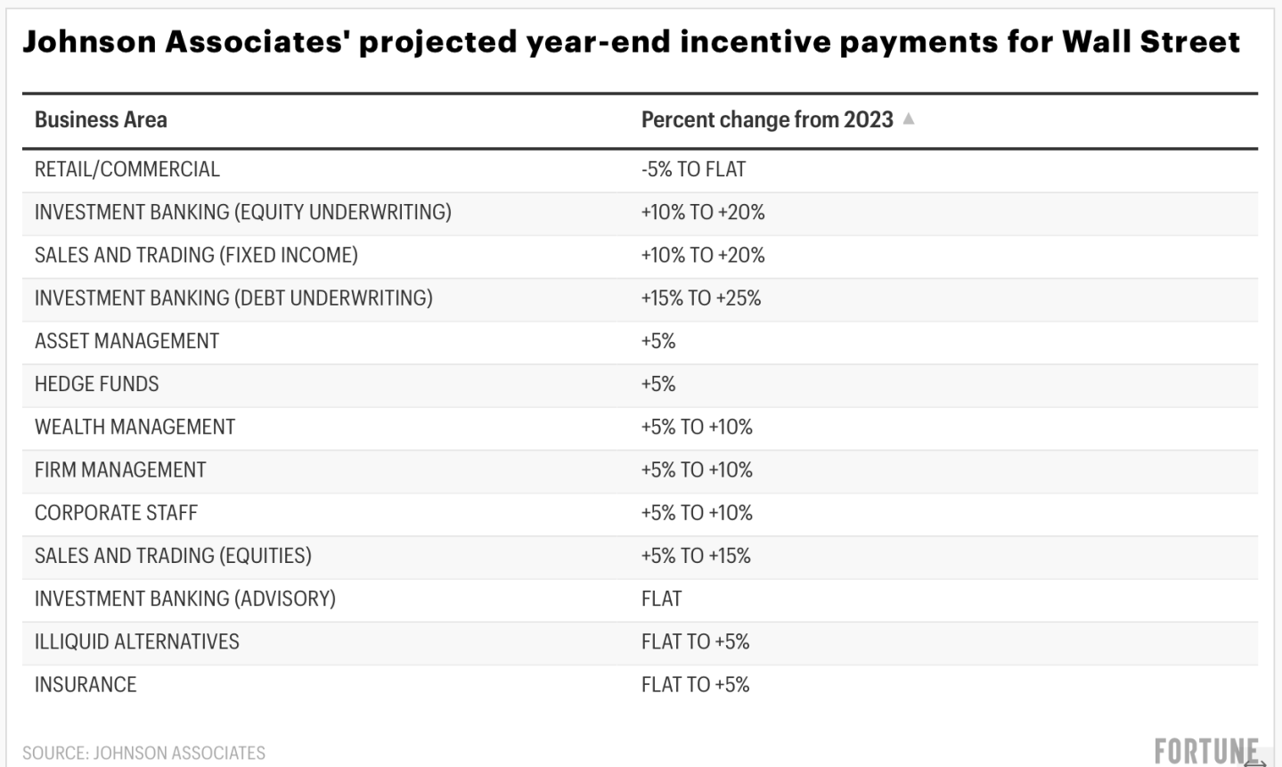 Meanwhile, corporate staff incentives (projected 5% to 10%) are trending higher with broader bonus pools, Connor said. Unsurprisingly, those at the very top are also in for a good year. For instance, Fortune recently reported that Jamie Dimon, CEO of JPMorgan Chase, the largest bank in the U.S., received his highest annual compensation package to date, a total of $36 million in 2023.