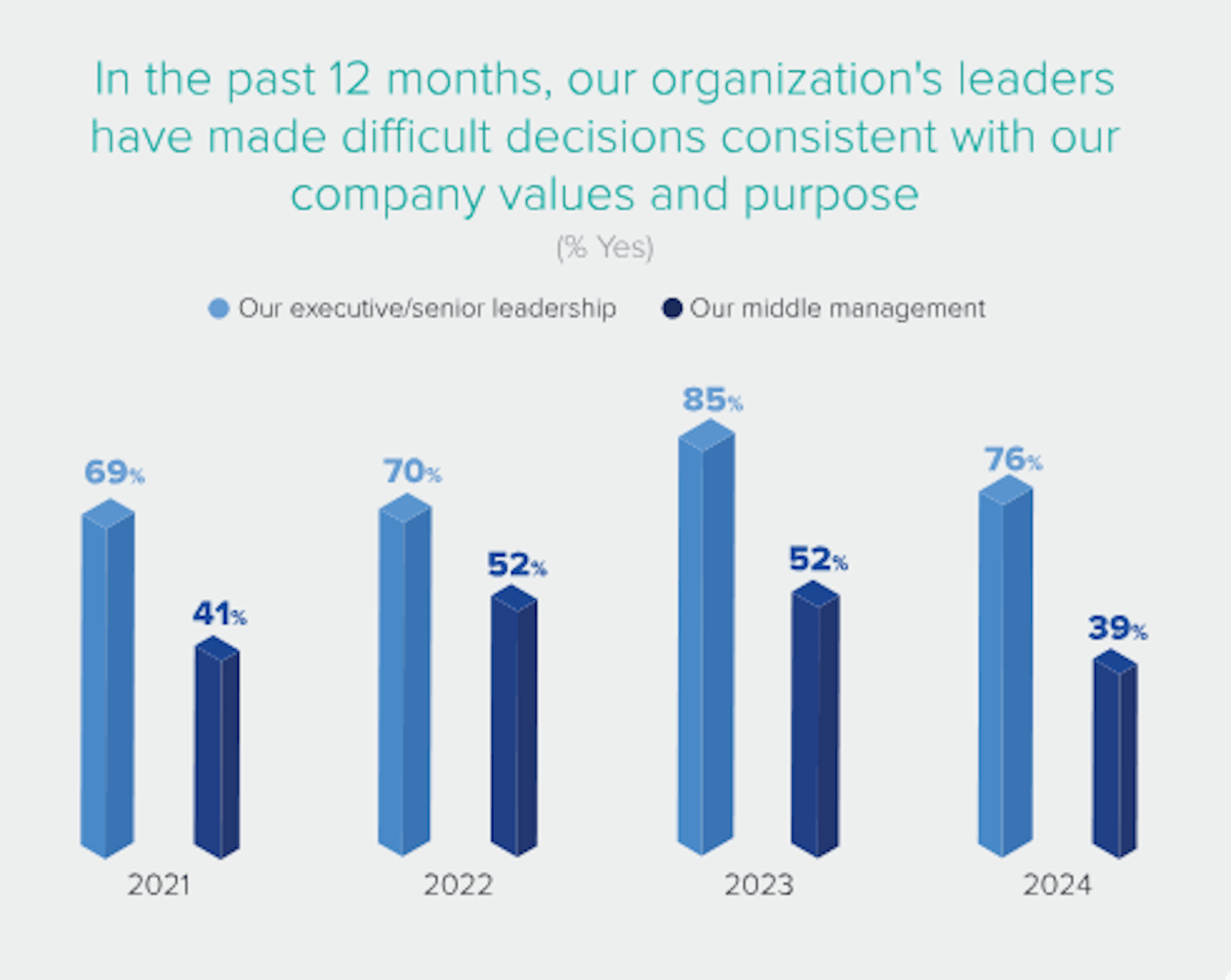 Middle managers, as those with whom most employees directly interact, are visible role models. This gap highlights the opportunity companies have to better support managers.