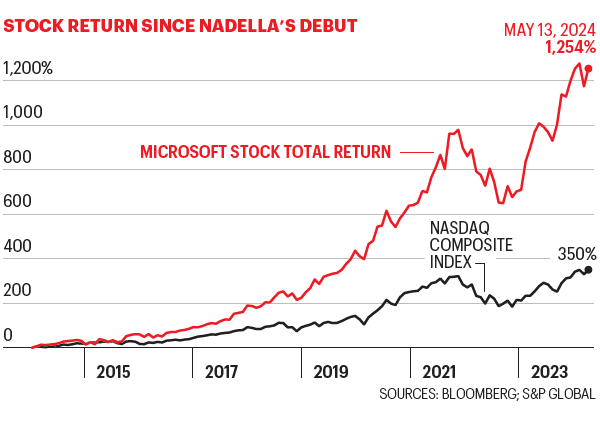 When Nadella took the reins at Microsoft in 2014, the company was floundering. Under his predecessor, Steve Ballmer, it had missed the smartphone revolution, was lagging on tablets, and was even losing market share in the PC operating system business that made it a household name. Microsoft’s shares had fallen more than 40% during Ballmer’s tenure. In 10-plus years as CEO, Nadella has reinvigorated the company, successfully steering it through two technological transformations: from PCs to the era of cloud computing, and now, to the age of AI. Nadella’s prescient and early bet on OpenAI and its technology, and the fruitful-if-sometimes-tense relationship that ensued, have given Microsoft as good a shot as any company at supremacy in this new era. The company arguably hasn’t been this powerful since it dominated the PC market in the 1990s’ “Wintel” era.